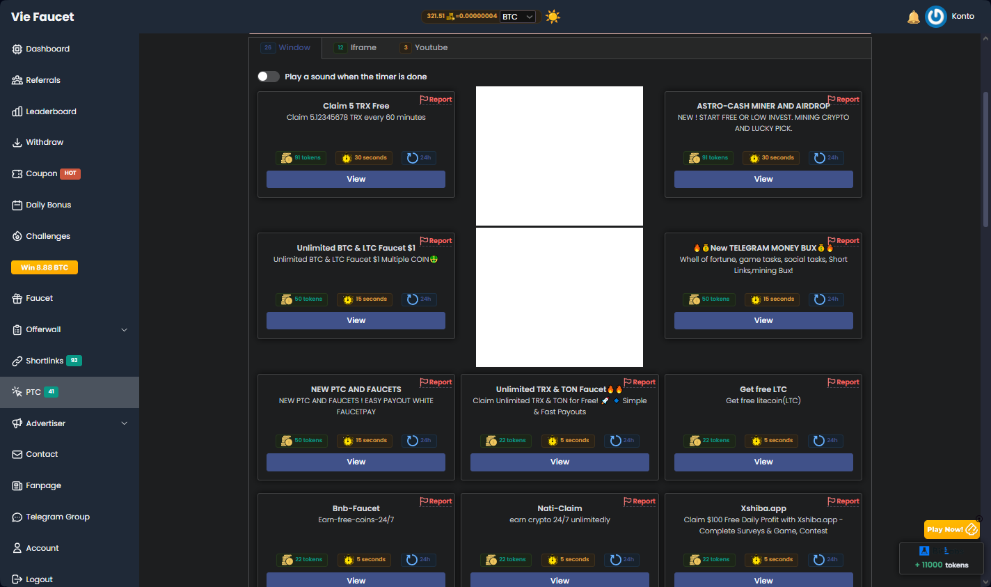 • VieFaucet (klikanie reklam – ok. 80 dziennie, ankiet, oferty, gry, video, faucet, dzienne bonusy)